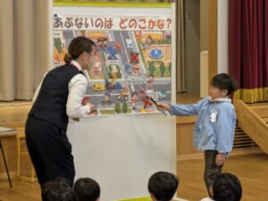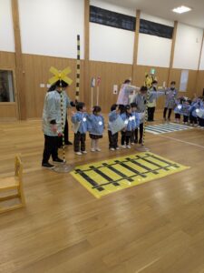 紙芝居や道路マップを見ながら、交通安全のお約束をおさらいしましたよ🚙 その後、模擬信号機・横断歩道・踏切を使って、実際に歩く練習をしました。