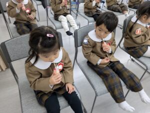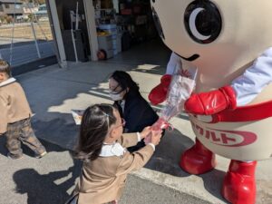 ヤクルトとお土産をいただき、ヤクルトマンと一緒に写真撮影もできましたよ! お友だちからも、ヤクルトマンに感謝の気持ちを込めてプレゼントを渡しました💐