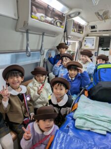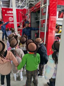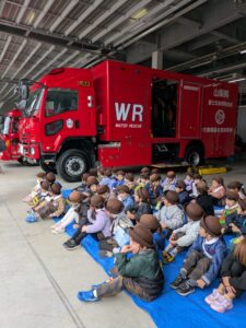 かっこいい消防車がお出迎えしてくれましたよ🚒 救急車の中や、消防車の色々な装備を見せてもらい、興味津々のお友だちでした🚑