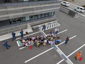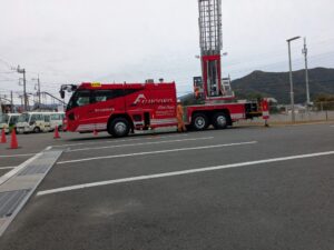 先生たちが代表ではしご車に乗せてもらい、高いところから写真をぱちり📷 とても高くてびっくりしましたね😲