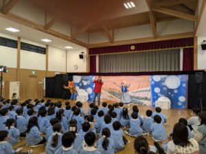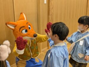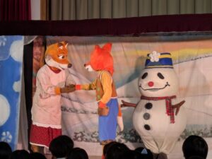きつねの「こんきち」と冬の妖精「シンシン」が登場すると、歓声があがり、みんな笑顔で楽しそうに